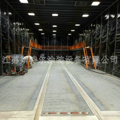 根據客戶要求及工件尺寸,房體工作尺寸設計為18x6x6.5m。本噴砂房體利用100mm方管做大致前端框架,內控利用50方管做內控維持,內控鋪2mm不銹鋼厚鋼板及3mm橡塑板,底下壁墻利用50mm厚彩厚鋼板瓦夾心板研制,樣貌整潔美觀、按裝便捷化、防污結實。彩不銹鋼厚鋼板夾心層為聚苯丁二烯發泡朔膠,與普通用純不銹鋼厚鋼板制造的